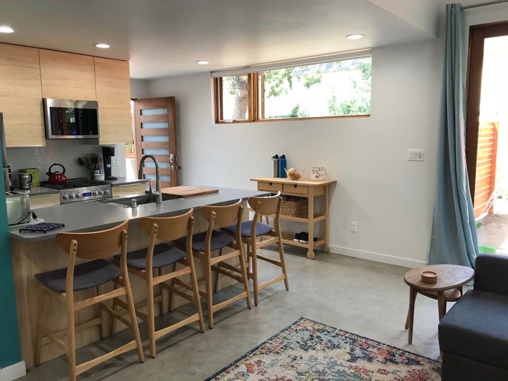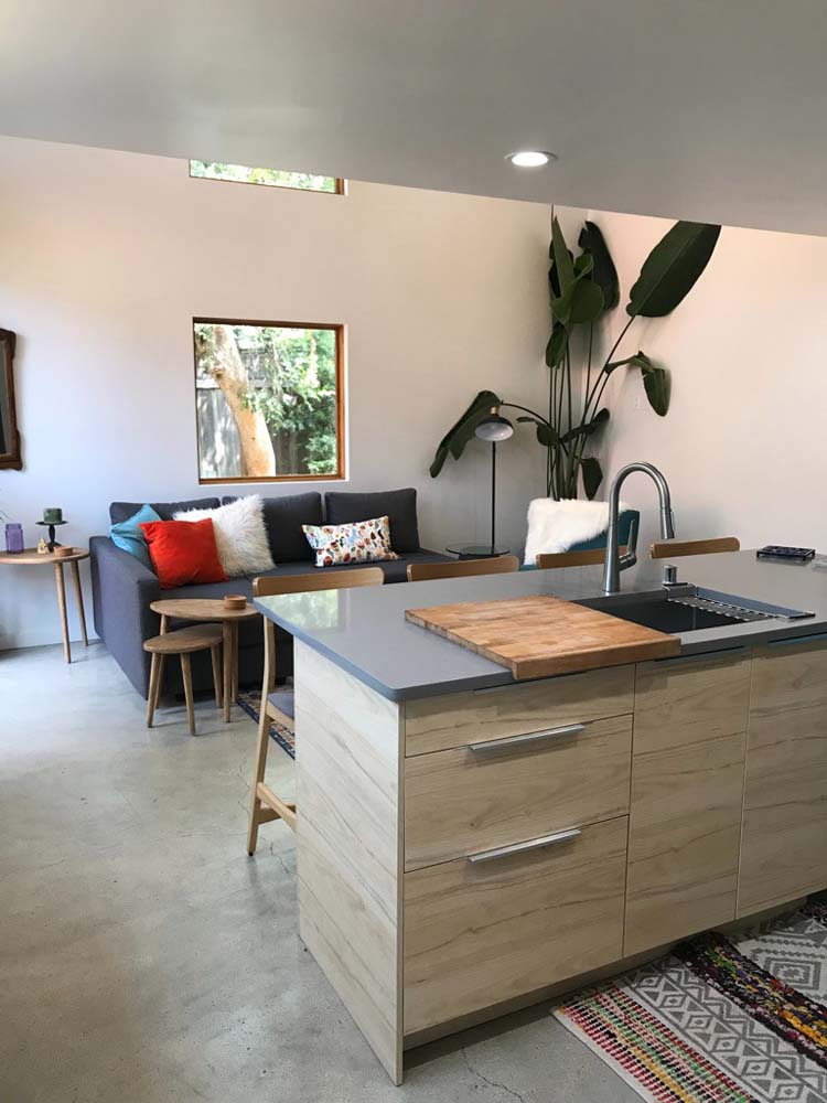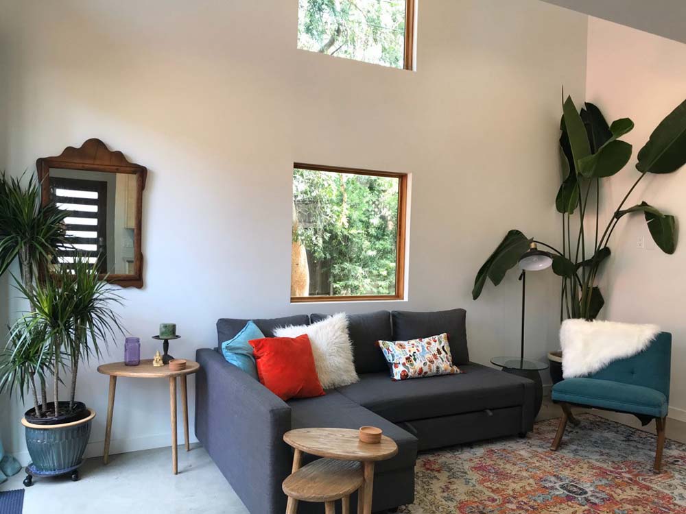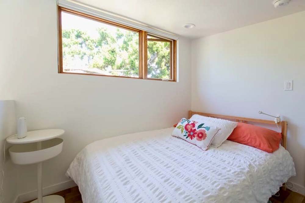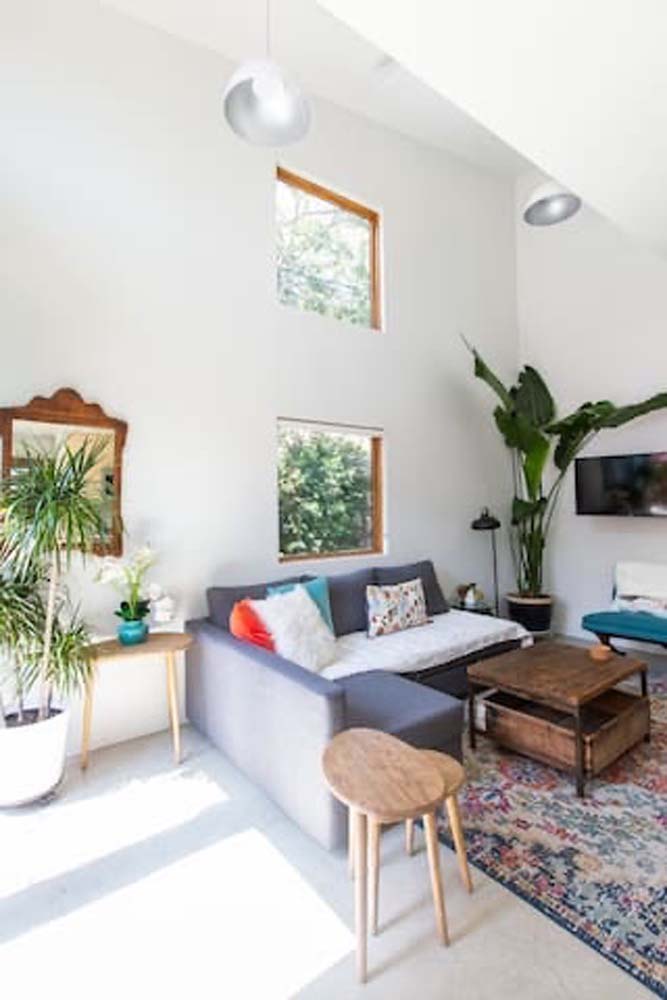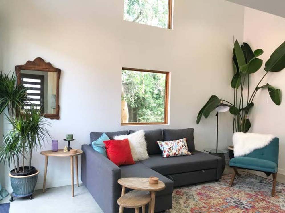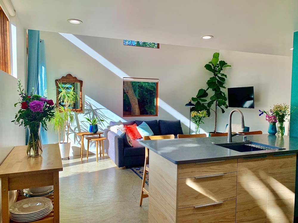Sunlight pours in through large windows of this beautiful rental property Los Angeles, bouncing off the vaulted ceilings to brighten every corner. The living area is furnished with a plush sofa-bed, smart TV, and breezy ambiance. Enjoy casual meals at the kitchen bar (seats 4), or prepare something special and take it outside for a garden dinner under string lights.